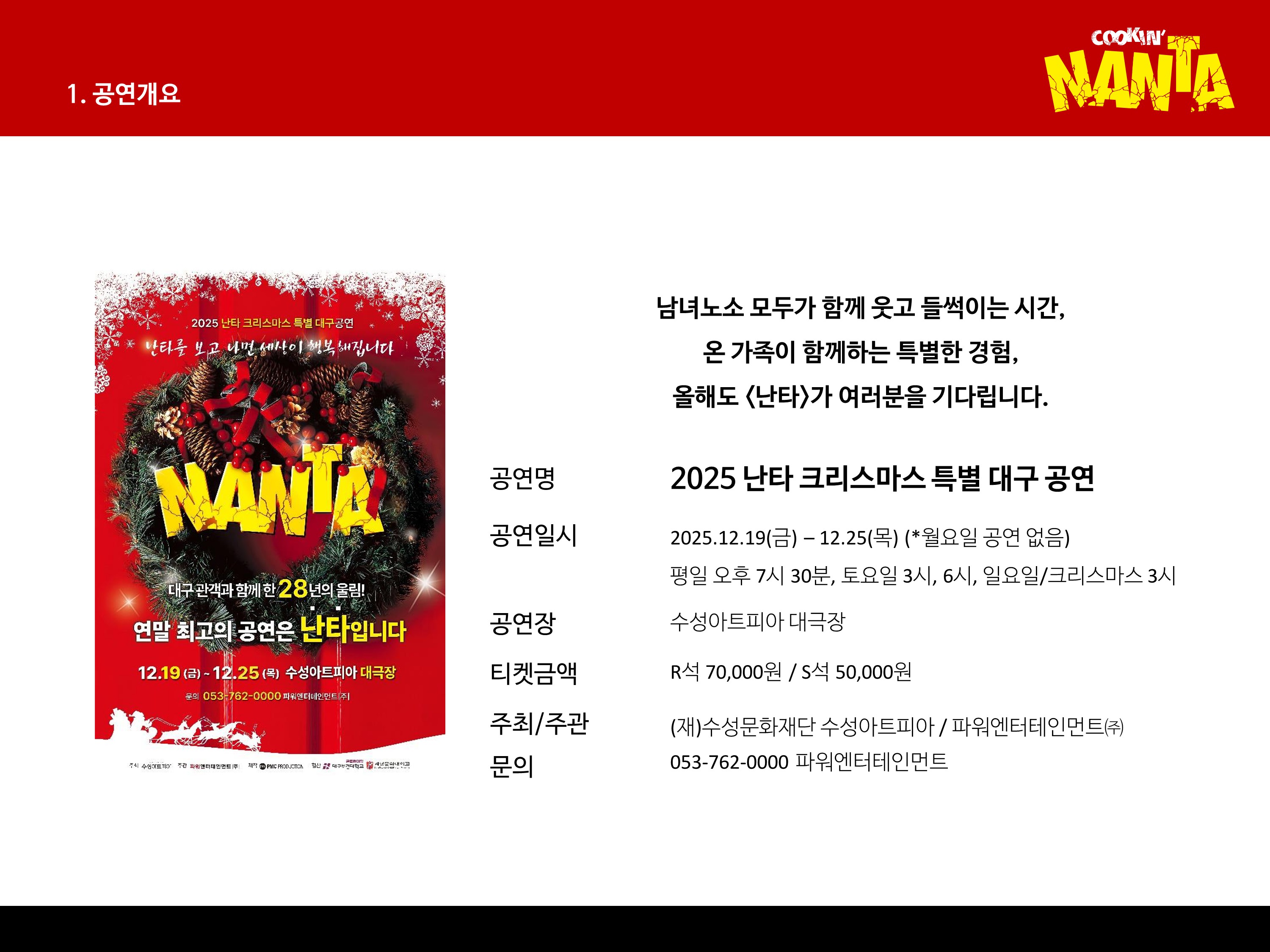 공연전시 뮤지컬 <난타> 대구공연 공연장 수성아트피아 대극장 공연기간 2025.12.19(금) ~ 2025.12.25(목) 공연시간 90분 관람연령 36개월이상 관람가능 티켓가격 R석 70,000원 / S석 50,000원 티켓예매 인터파크 목록으로