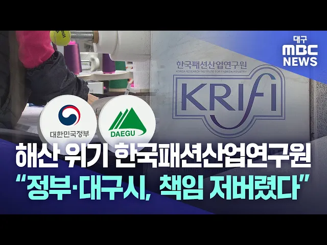 ◀앵커▶경영난에 시달리던 한국패션산업연구원이 해산 위기에 놓였습니다.2024년 말 이사회에서 더 이상 기관 설립 목적을 달성할 수 없다는 결론을 내린 데 이어 1월 15일 관계 당사자들의 의견을 듣는 청문회만 남겨놓고 있는데요. 노조는 연구원을 활성화해야 할 정부와 대구시가 책임을 저버렸다며, 해산 결정을 한다면 ...