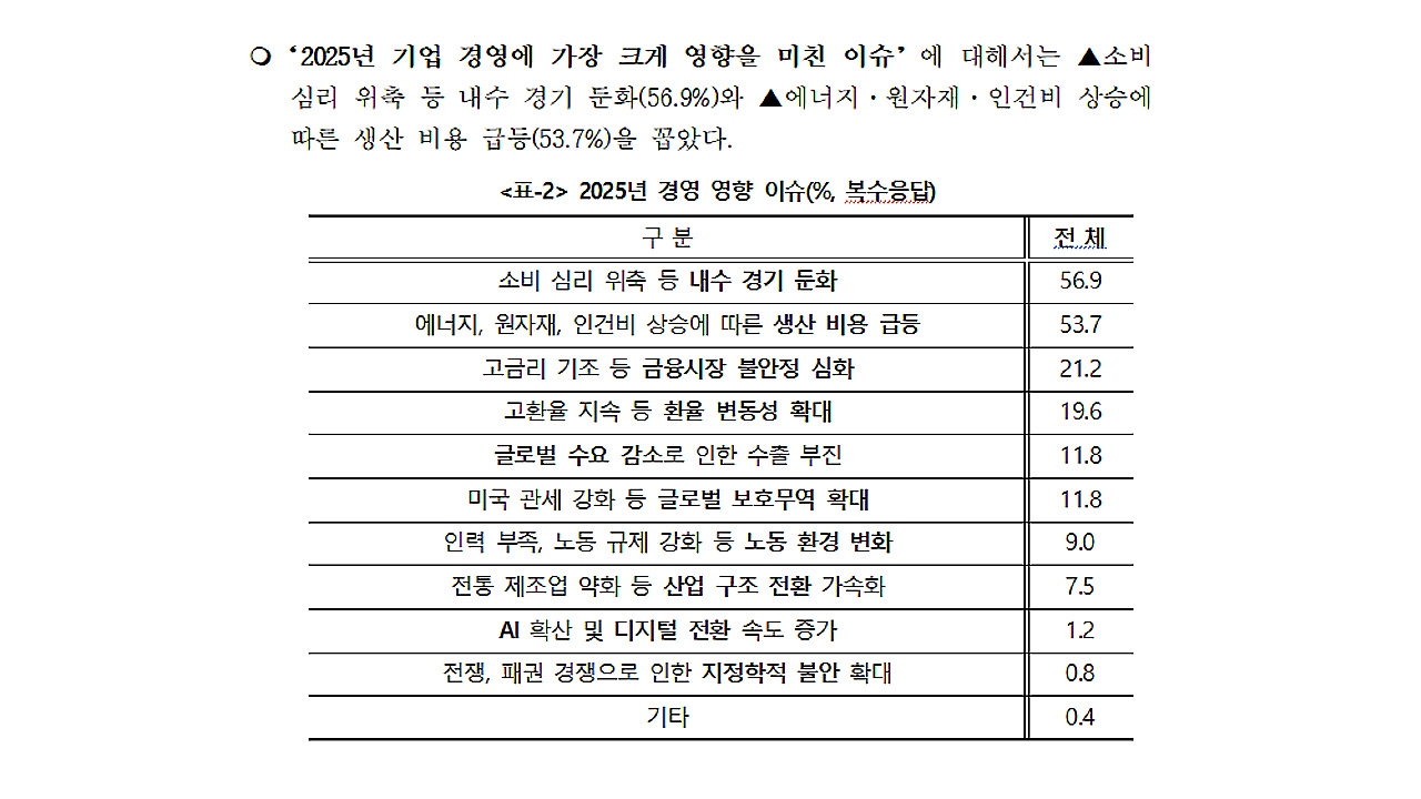대구 지역 기업들은 새해를 앞두고 경영 비용 부담 완화와 경영 환경 안정에 대한 기대가 가장 큰 것으로 나타났습니다.대구상공회의소가 대구 지역 기업 255개사를 대상으로 2026년 가장 개선되기를 희망하는 경영 환경 키워드를 조사했더니 '인건비, 에너지, 물류비 등 경영 비용 부담 완화'가 72.9%로 가장 많았고, 환율...
