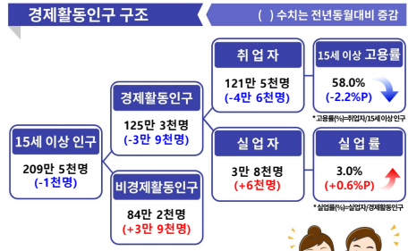 사진 제공 동북지방통계청10월 대구 고용률이 2023년보다 떨어지면서 1년째 전년 대비 감소세가 이어졌습니다. 동북지방통계청이 발표한 2024년 10월 대구 고용동향에 따르면 10월 대구의 고용률은 58%로 2023년 10월보다 2.2% 포인트 떨어졌습니다. 2023년 11월부터 12개월째 전년 동월 대비 고용률 감소 추세가 이어졌습...
