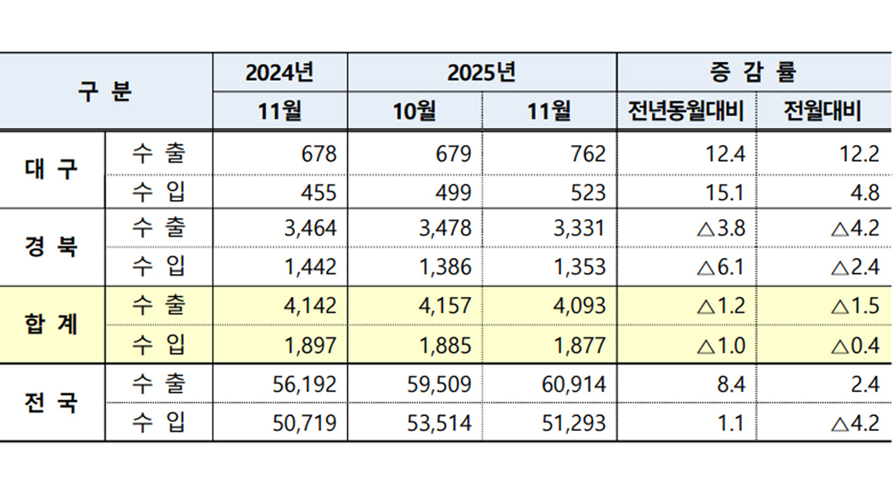 대구·경북의 무역수지 흑자가 두 달 연속 감소했습니다.대구본부세관의 2025년 11월 수출입 동향을 보면 대구·경북의 수출은 1년 전보다 1.2% 감소한 40억 9천만 달러, 수입은 1.0% 감소한 18억 7천만 달러를 기록했습니다.무역수지는 1.8% 감소한 22억 2천만 달러 흑자를 기록했습니다.대구와 경북의 무역수지 흑자는 지난...