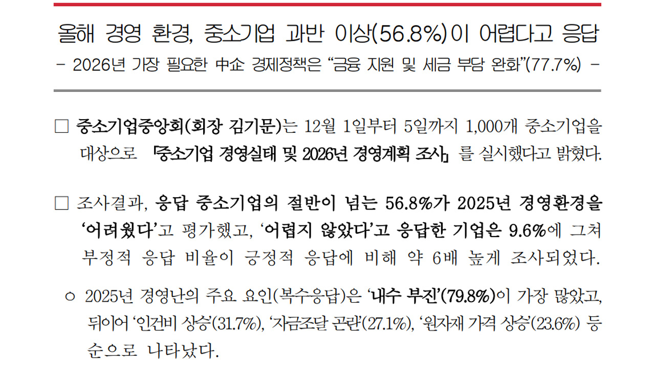 중소기업중앙회가 12월 1일부터 5일까지 1,000개 중소기업을 대상으로 '중소기업 경영 실태 및 2026년 경영계획 조사'를 실시한 결과 응답 중소기업의 절반을 넘는 56.8%가 2025년 경영환경을 '어려웠다'고 평가했습니다.'어렵지 않았다'고 응답한 기업은 9.6%에 그쳐 부정적인 응답이 약 6배 높았습니다.2025년 경영난의 ...