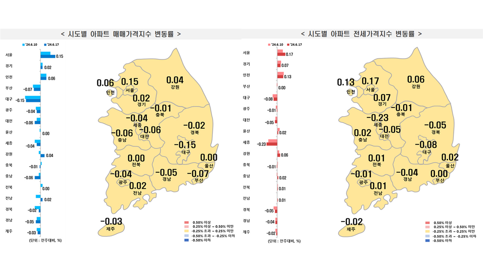 사진 제공 한국부동산원대구의 아파트 매매가격이 31주 연속, 전셋값은 35주 연속 하락했습니다. 한국부동산원의 2024년 6월 셋째 주(6월 17일 기준) 주간 아파트 가격 동향에 따르면 대구의 아파트 매매가격은 한 주 전보다 0.15% 떨어졌습니다. 6월 둘째 주(-0.16%)보다는 하락 폭이 조금 줄었지만, 여전히 전국 시도 가...