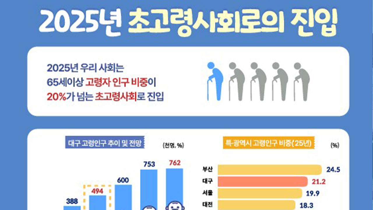 참고 제공 동북지방통계층오는 2052년에는 대구 인구 10명 중 4명이 65살 이상 고령자가 될 것으로 전망됐습니다.동북지방통계청이 발표한 '과거와 달라진 대구·경북 고령자 특성' 자료를 보면 2052년 대구 고령 인구 비중은 42.5%로 2025년의 21.2%보다 2배로 늘어날 것으로 전망됐습니다. 2024년 기준 대구 고령자의 경제...