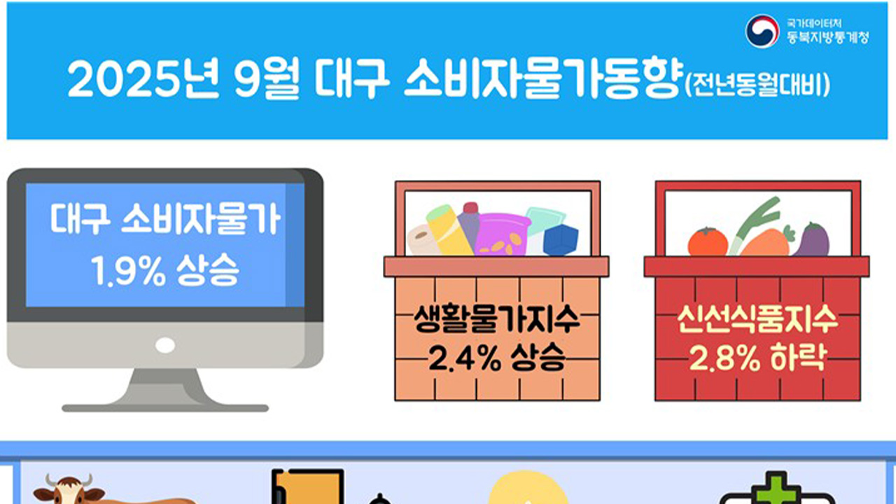 참고 제공 동북지방통계청대구의 소비자물가 상승률이 2개월 연속 1%대를 기록했습니다. 동북지방통계청이 발표한 '2025년 9월 대구·경북 소비자물가 동향'에 따르면 대구의 2025년 9월 소비자물가지수는 116.96(2020년=100)으로 1년 전보다 1.9% 상승했습니다. 8월(1.6%)보다 상승 폭은 커졌지만, 두 달 연속 1%대를 유지...
