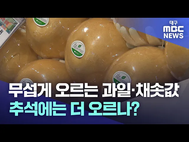 ◀앵커▶추석 연휴가 한달여 앞으로 다가왔습니다.전통적인 추석 제수용품으로 꼽히는 사과와 배를 중심으로 과일과 채소류 값이 무섭게 오르고 있습니다.유독 변덕이 심했던 날씨 탓에 생산량이 많이 줄었기 때문입니다. 김철우 기자가 보도합니다. ◀기자▶추석 연휴가 한 달 앞으로 다가온 가운데 백화점과 마트에서는 추석 ...