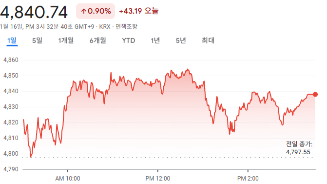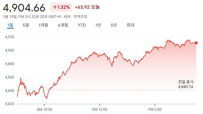 코스피가 4,900선을 넘기며 거래일 기준으로 12일 연속 사상 최고 기록을 갈아치웠습니다.1월 19일 코스피 지수는 4,904.66으로, 전 장보다 1.32% 올랐고, 코스피 5천까지 100포인트도 남지 않았습니다.코스피는 전 장보다 0.23% 내린 4,829.40으로 시작했지만 곧 상승세로 돌아섰고, 오후 2시쯤에는 4,917.37까지 올라가며...