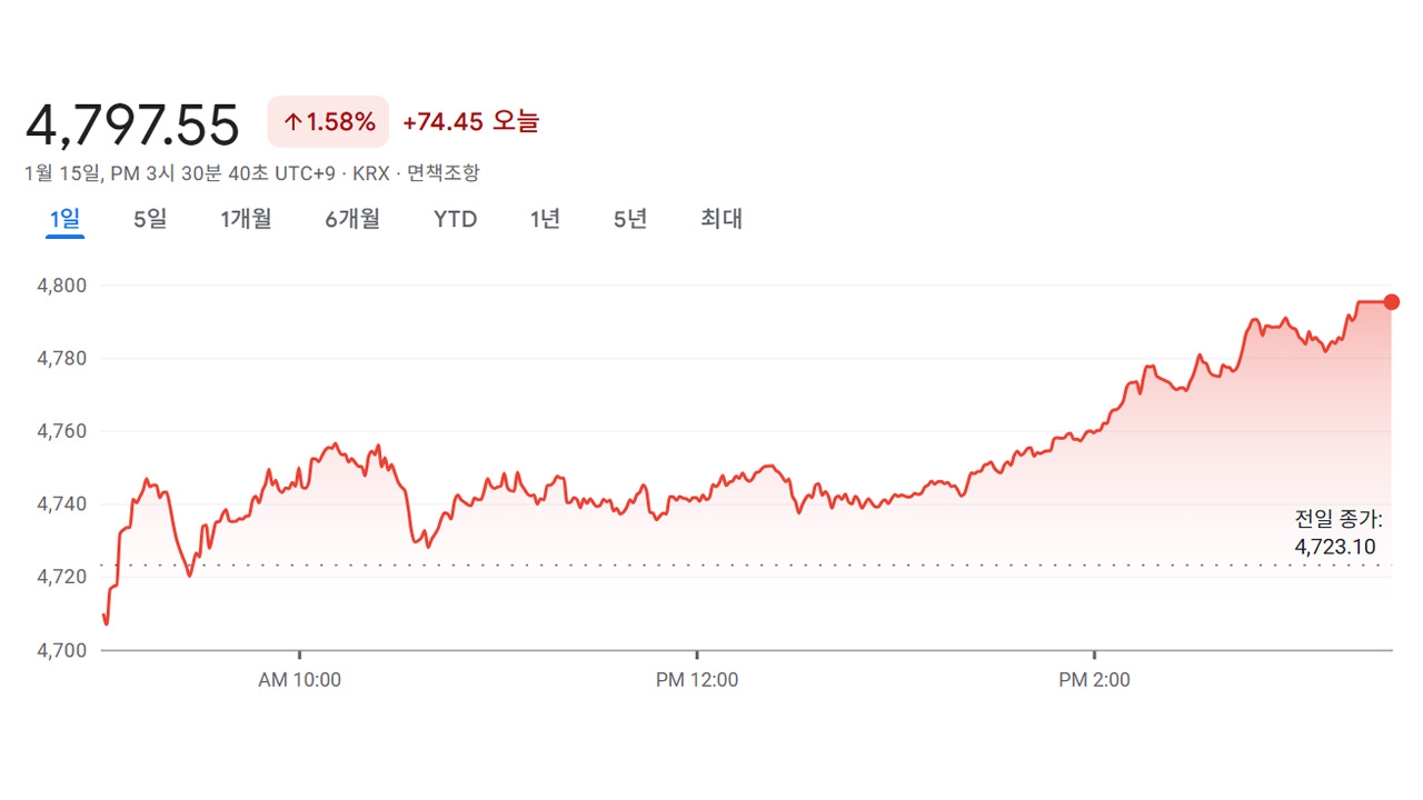 10거래일 연속 사상 최고치를 경신해 온 코스피가 4797.55로 장을 마감했습니다.15일 한국거래소에 따르면 코스피는 전일과 비교해 74.45포인트, 1.58% 상승한 4797.55로 장을 마감하면서 4,800선까지 2.45포인트, 0.05%의 상승만을 남겨두고 있습니다.이재명 대통령이 언급한 코스피 5000 돌파도 이제 단 4.22%만 상승하면...