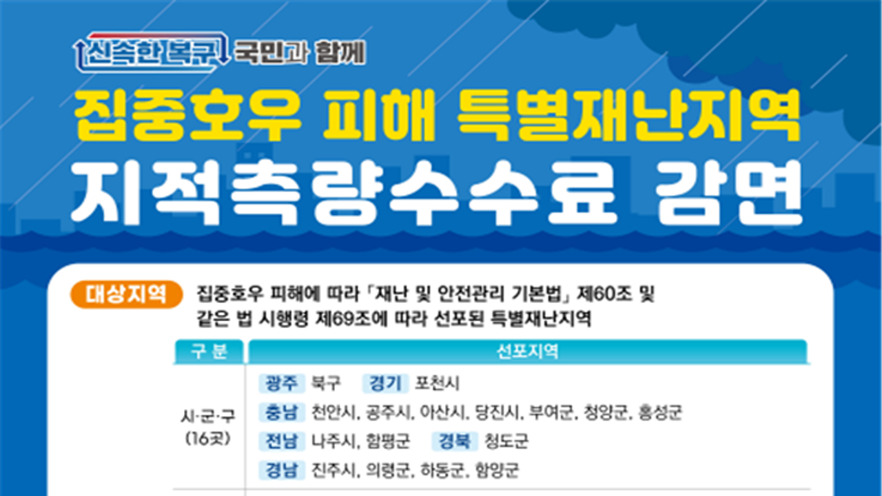8월 7월 극한 호우로, 특별재난지역으로 선포된 경북 청도군에 지적 측량 수수료가 감면됩니다.이는 청도군 주민들의 경제적 부담을 줄이고, 신속한 피해 복구를 위한 것으로, 국토교통부가 지적 측량 수수료 감면 요청을 승인한 데 따른 것입니다.감면 대상은 호우 피해 복구를 위해 측량 수행기관인 한국국토정보공사에 ...