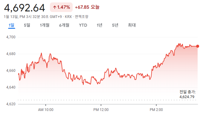 코스피가 8일 연속 오르면서 또다시 사상 최고치를 경신했습니다.1월 13일 코스피 지수는 전날보다 1.47% 오른 4,692.64로, 4,700선을 눈앞에 두고 있습니다.지수는 전날보다 0.81% 오른 4,662.44로 장을 시작해 한때 4,641.58로 물러났다가, 장 후반에 오름폭을 키웠습니다.외국인이 2천 7백억 원가량 순매도했고, 기관이 ...