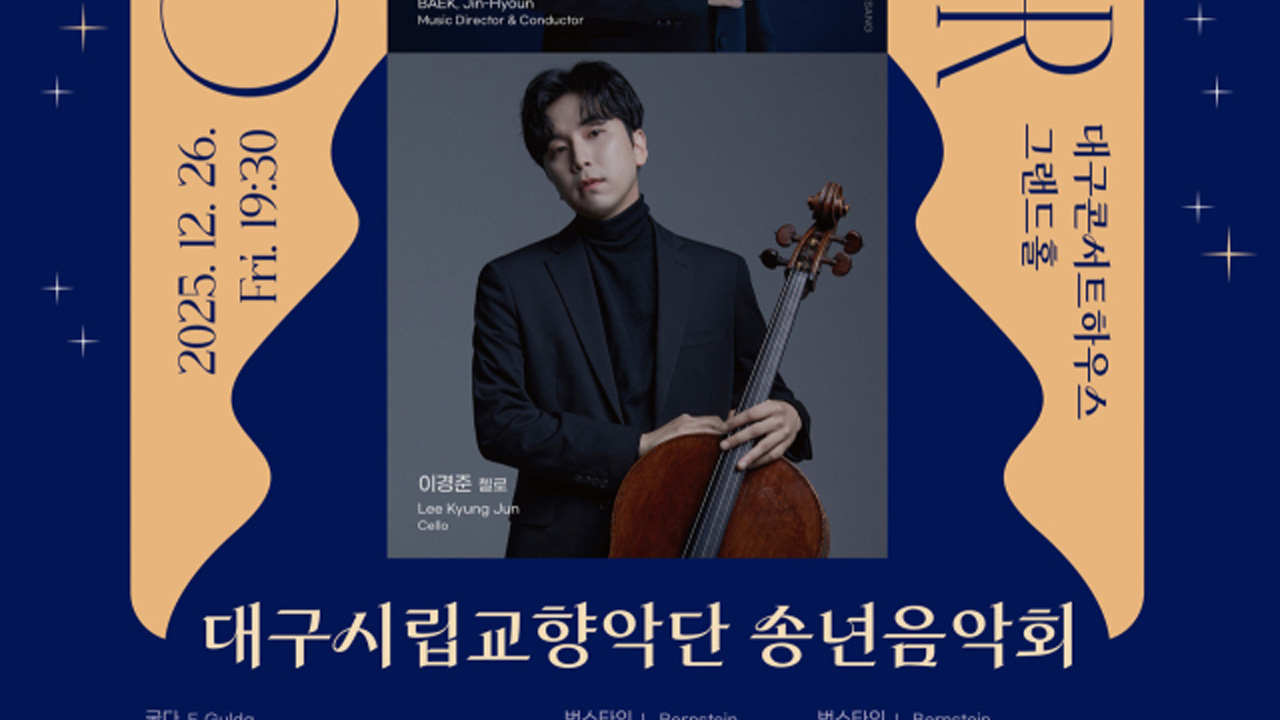 연말을 장식할 대구시립교향악단의 '2025 송년 음악회: 클래식 크로스오버'가 12월 26일 오후 7시 30분 대구콘서트하우스 그랜드홀에서 열립니다.이번 공연은 클래식에 재즈, 오페레타, 뮤지컬의 요소를 결합한 다채로운 무대로 구성했습니다.1부에서는 첼리스트 이경준이 프리드리히 굴다의 '첼로 협주곡'을 협연합니다.피...