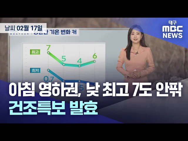 2월 17일 월요일은 대체로 맑은 가운데 춥고 대기가 건조하겠습니다.군위를 제외한 대구와 일부 경북 내륙, 동해안과 북동 산지에 건조특보가 발효 중입니다. 경북 북동 산지에는 한파주의보가, 동해안에는 강풍주의보가 내려져 있습니다. 낮 최고 기온은 대구 7도, 구미 6도, 청송 4도 등 3도에서 7도로 전날보다 5~7도가...