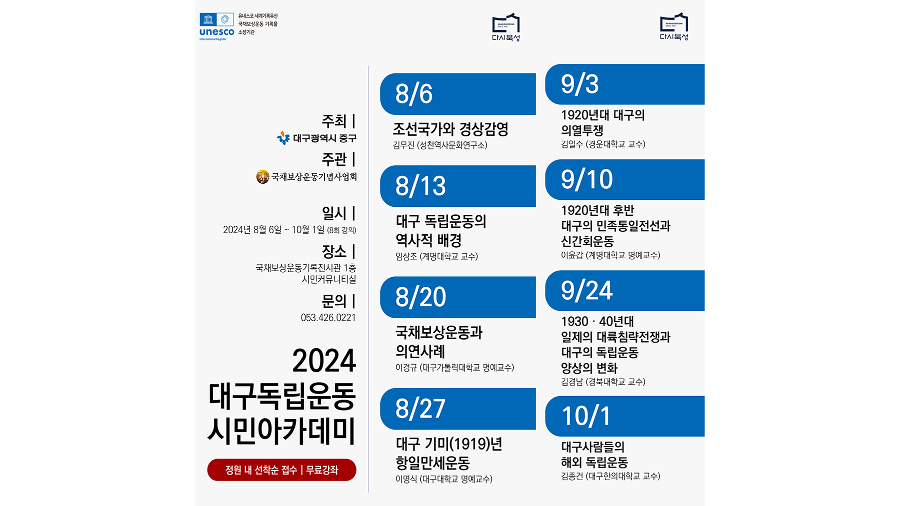 사진 제공 대구시 중구대구 독립운동에 대한 이해를 높이기 위한 2024 대구 독립운동 시민 아카데미가 열립니다.대구 중구가 주최하고 (사)국채보상운동 기념사업회가 주관하는 대구 독립운동 시민 아카데미는 오는 10월까지 매주 화요일 국채보상운동기념관 시민커뮤니티실에서 열립니다.임삼조 계명대학교 교수의 '대구 ...