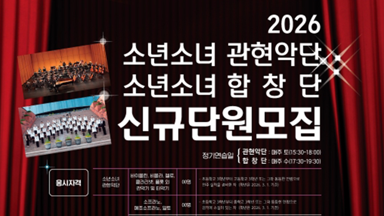 김천시 문화예술회관이 시립 예술단 신규 단원을 모집합니다.모집 분야는 시립 국악단(거문고), 시립 합창단(소프라노·알토), 소년소녀 관현악단(학생 단원), 소년소녀 합창단(반주자, 학생 단원)으로, 1월 26일부터 1월 30일까지 원서를 접수합니다.소년소녀 합창단 반주자를 포함해 성인 단원은 김천시 문화예술회관을 방...