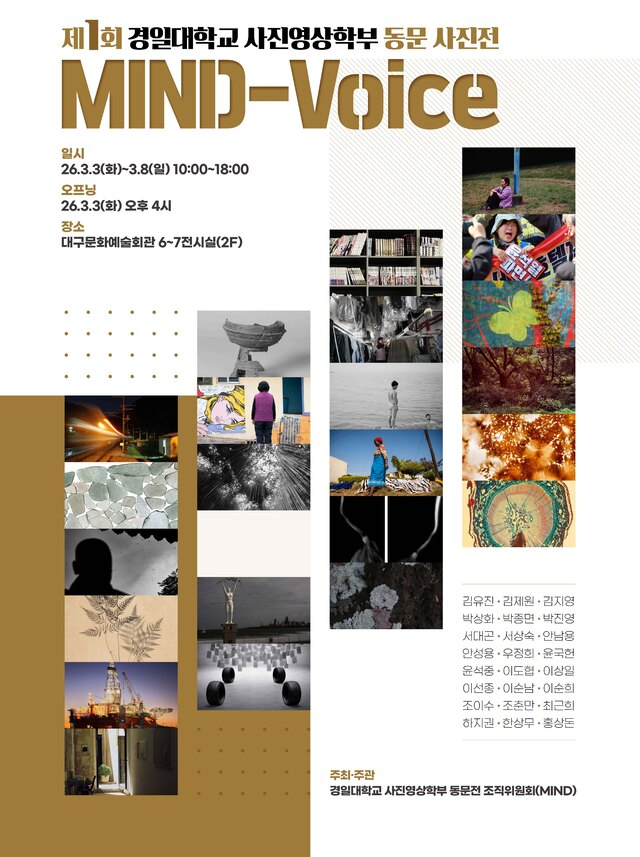 경일대학교 사진영상학부 동문이 첫 번째 동문 사진전을 38년 만에 처음으로 엽니다.3월 3일부터 8일까지 대구문화예술회관 제6~7전시실에서 열리는 ‘마인드-보이스(MIND-Voice)’전은 1988년 학과 개설 이후 처음으로 개최하는 동문전으로 작가 24명이 참여합니다.이번 전시는 다큐멘터리와 순수예술, 상, 창작 사진 등 다...
