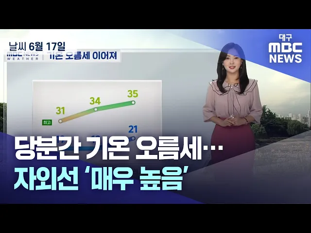 6월 16일 일요일 대구와 경북 지역은 대체로 맑은 가운데 한여름 날씨를 보였습니다.낮 최고 기온은 경주 황성 33도, 김천 31.8도, 대구 31.5도 등 25.4도에서 33도로 토요일보다 조금 낮았습니다. 월요일인 17일도 대체로 맑겠고 불볕더위가 이어지겠습니다.아침 최저 기온은 대구 19도 등 13도에서 21도를 보이겠고, 낮 ...