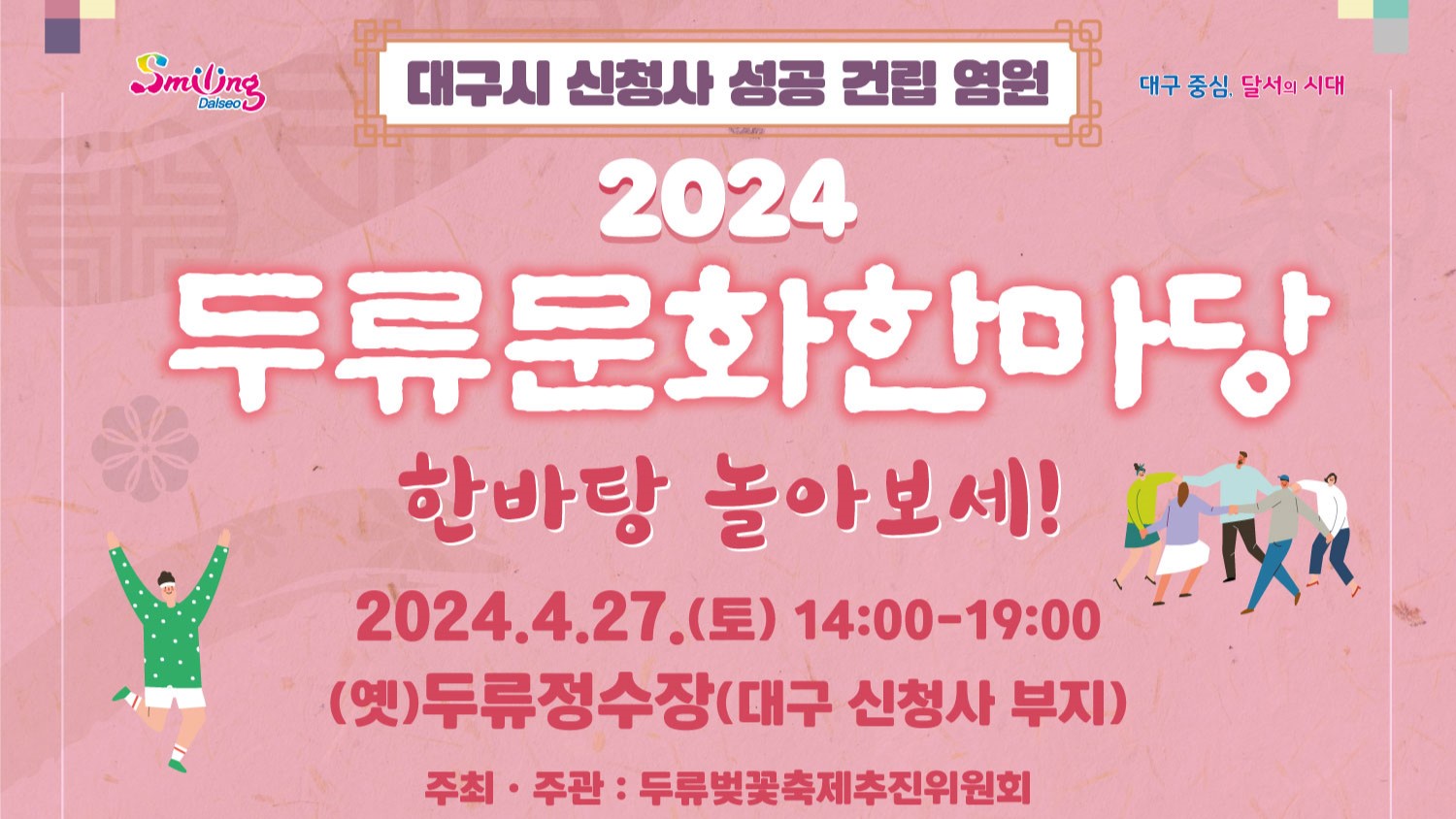 사진 제공 대구 달서구대구 달서구가 4월 27일 대구시 신청사 부지로 결정된 옛 두류정수장 터에서 '2024 두류 문화한마당' 행사를 엽니다.성공적인 신청사 건립을 바라며 길쌈놀이와 활쏘기, 디딜방아 등 전통문화와 농경 문화를 체험할 수 있고 풍물놀이와 비보이 합동 공연, 버스킹 등 다채로운 공연을 선보입니다.
