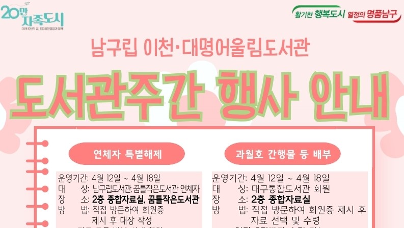 사진 제공 대구 남구대구 남구가 제60회 도서관 주간, 세계 책과 저작권의 날을 맞아 오는 4월 12일부터 18일까지 남구립도서관에서 다양한 독서·문화 행사를 엽니다.구립도서관인 이천도서관과 대명어울림도서관이 작가와의 만남, 동화책 읽고 꽃꽂이 배우기, 독서기록장 배부 등 행사를 마련했습니다.자세한 내용은 도서...