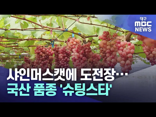 ◀앵커▶과일 시장에서 인기몰이 중인 샤인머스캣에 국산 신품종 포도 '슈팅스타'가 도전장을 내밀었습니다.독특한 색깔에 당도도 샤인머스캣보다 더 높아 스타 품종이 될 것으로 기대를 모으고 있습니다.김건엽 기자입니다.◀기자▶농촌진흥청 산하 국립원예특작과학원의 포도 시험 재배 농장입니다.불그스한 색깔의 포도가 주...