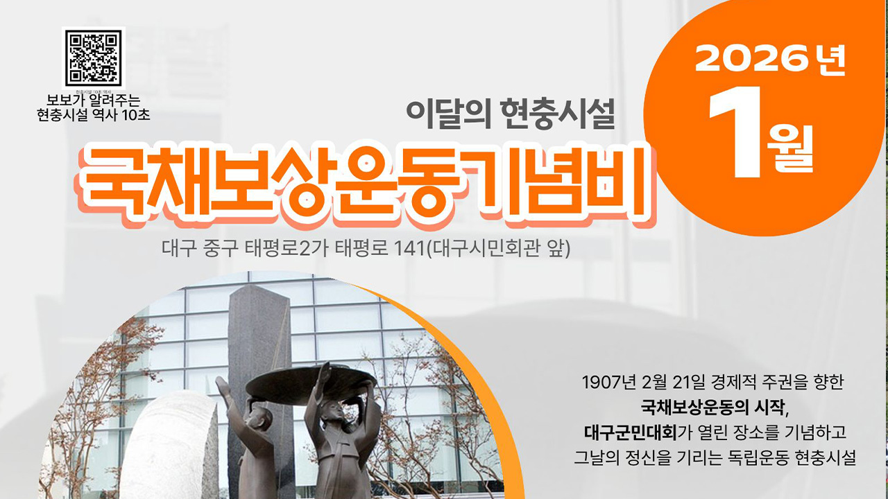 대구지방보훈청이 대구 중구 콘서트하우스에 있는 국채보상운동 기념비를 이달의 현충 시설로 선정했습니다.국채보상운동은 대한제국이 일제에 반강제로 진 1천3백만 원의 빚을 국민이 갚아 국권을 되찾기 위한 운동으로, 1907년 대구에서 시작됐습니다.1907년 1월 29일 대구 광문사 회의에서 서상돈의 발의로 작성된 국채 ...