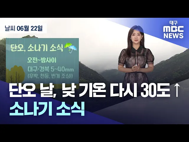 단오인 6월 22일 대구·경북 지역은 구름 많은 가운데 오전부터 밤사이 5~40mm의 소나기가 내리는 곳이 있겠습니다.돌풍과 함께 천둥·번개가 치고 우박이 떨어지는 곳도 있겠습니다.21일부터 22일 오전 7시 30분까지 누적 강수량은 문경 36.7mm, 대구 4.6mm, 상주 20.9mm입니다.22일 낮 최고 기온은 대구 30도, 안동 28도, ...