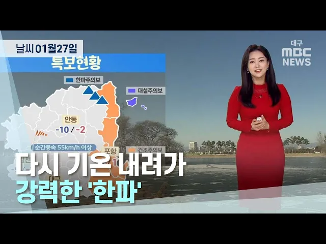 대구와 경북 지역은 밤사이 곳곳에 눈이 내려 쌓인 가운데 종일 춥겠습니다.1월 27일 아침 최저 기온은 대구 영하 4.2도, 김천 영하 11.6도, 안동 영하 12.5도 등을 기록했습니다.경북 북동 산지에 한파주의보가, 동해안 지역에는 건조주의보가 발효 중입니다.27일 낮 최고 기온은 대구 0도 등 영상 2도에서 영하 4도의 분...