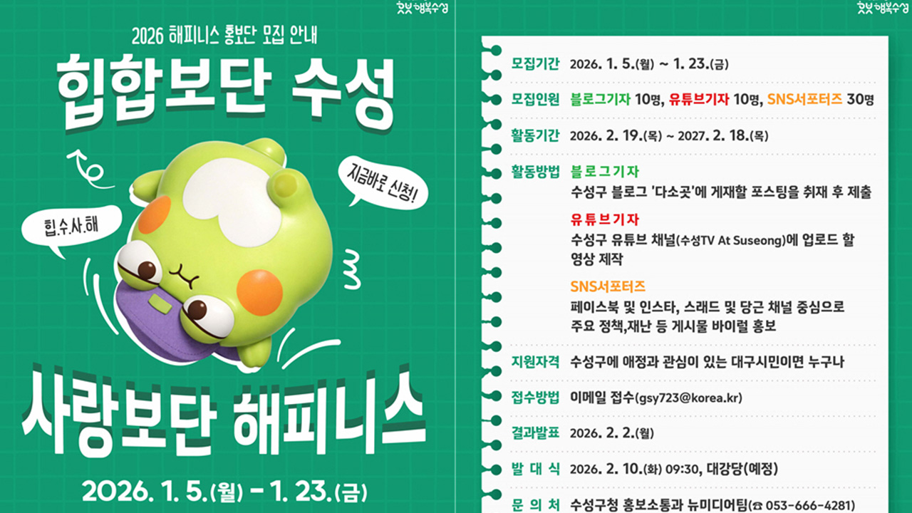 대구 수성구가 2026년 '해피니스 홍보단'을 모집합니다.홍보단은 1년 동안 수성구의 주요 사업과 정책, 문화·생활 정보와 관련한 콘텐츠를 만들고 SNS를 통해 주민들에게 알리는 역할을 합니다.블로그 기자 10명, 유튜브 기자 10명, SNS 서포터즈 30명 등 모두 50명을 선발하고, 홍보단에게는 위촉장과 기자증, 소정의 활동...
