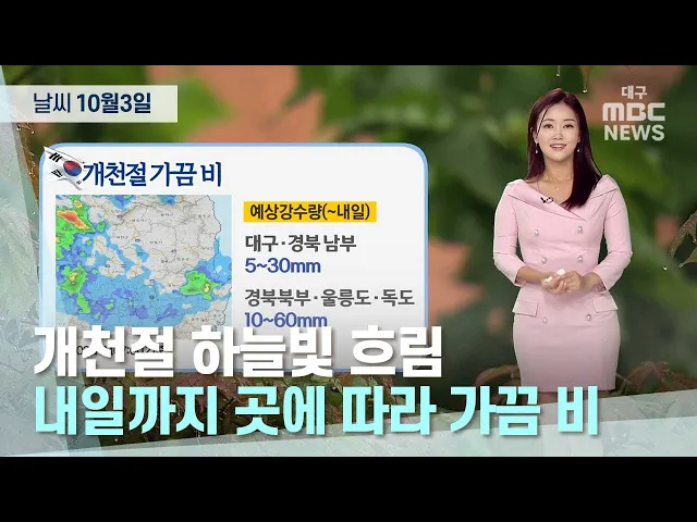 개천절 연휴 잘 보내고 계신가요?10월 3일, 우리 지역은 서해북부해상에서 동쪽으로 이동하는 저기압의 영향으로 가끔 비가 내리겠습니다. 이 비는 오전부터 밤사이 소강상태를 보이는 곳이 많겠습니다. 내일은 더 많은 양의 비가 내리겠는데요. 북서쪽에서 다가오는 찬 공기가 우리나라로 유입된 따뜻한 공기와 충돌해 비...