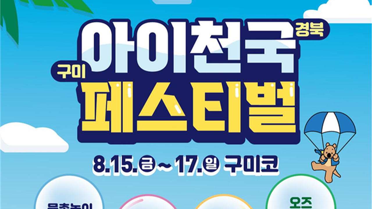 광복절 연휴 경북 구미에서 '아이천국 경북 구미 페스티벌'이 열립니다.구미코에서 8월 15일부터 3일간 열리는 아이천국 페스티벌은 저출생 극복과 아이 우선 문화 확산을 위해 경상북도와 구미시가 공동으로 개최합니다.아이들이 좋아하는 인기 캐릭터 공연인 '캐리와 친구들 싱어롱쇼'를 비롯해 마술 공연과 물총놀이 체...