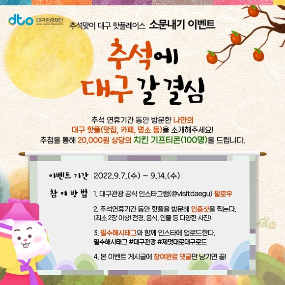 대구시와 대구관광재단은 9월 한 달 대구를 방문하는 관광객과 대구 시민을 대상으로 풍성한 관광 이벤트를 마련합니다.9월 1일부터 30일까지 대구수목원과 동화사, 수성못 같은 14개 생태자원 코스와 김광석길, 서문시장, 약령시 등 14개 주요 관광지 가운데 7곳 이상을 방문하고 도장을 받으면 기념품을 제공합니다.9월 7...
