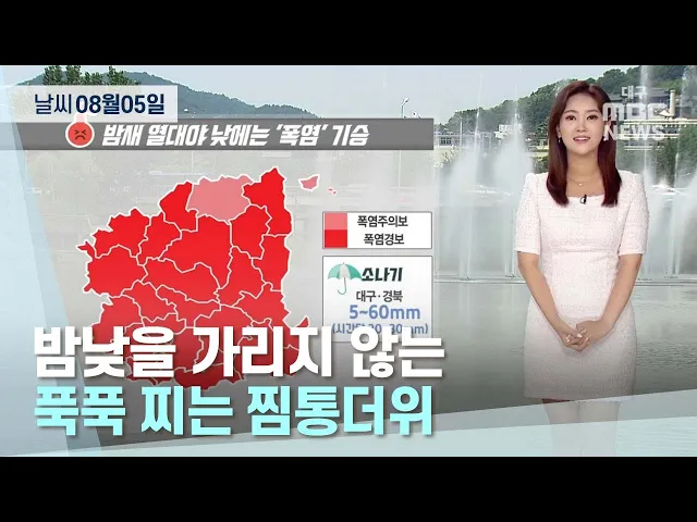 8월 5일 대구 경북은 폭염특보가 발효된 가운데 낮 최고기온이 35도 안팎까지 올라 매우 무덥겠습니다.현재 대구와 북동 산지를 제외한 경북 전역에는 폭염경보가, 나머지는 폭염주의보가 내려져 있습니다.대구와 경산, 칠곡 등 포항과 상주 등지에는 밤사이 최저기온이 25도 이상 유지되는 열대야가 나타났습니다.5일 낮 ...