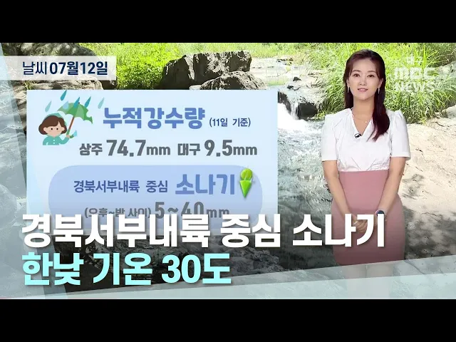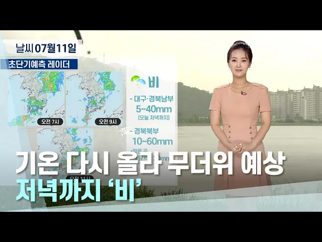 7월 10일 일요일 대구와 경상북도는 낮 최고기온이 35도 안팎을 기록하는 무더운 날씨가 이어졌습니다.청송 안동 봉화 등 경북 일부 지역엔 낮에 소나기가 내렸습니다.7월 10일 9시 이후부터 7월 11일까지 경북 북부지역은 10~60밀리미터, 대구와 경북남부지역엔 5~40밀리미터의 비가 오겠습니다.월요일인 7월 11일 아침은 ...