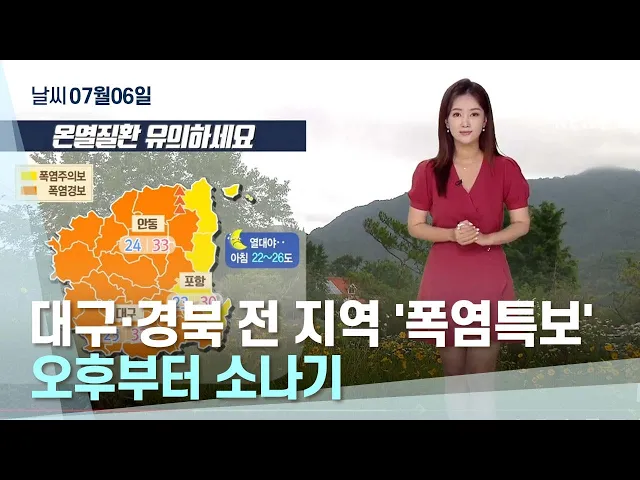 대구와 경북 지역은 전역에 폭염 특보가 계속되는 가운데 대체로 흐리고 곳곳에서 소나기가 쏟아지겠습니다.예상 강수량은 밤까지 5~40mm, 많은 곳은 60mm 이상 내리겠고, 곳에 따라 돌풍이 불고 천둥·번개가 치겠습니다.7월 6일 낮 최고 기온은 대구·안동 33도 등 27~33도로, 체감온도는 더 높겠습니다.목요일도 흐리고 무...