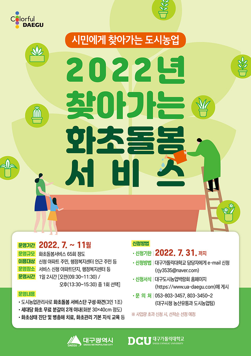 대구시가 반려 식물을 키우는 시민을 위해 찾아가는 화초 돌봄 서비스단을 운영합니다.분갈이 2개를 무료로 해주고 화초 관리에 대한 기본 지식과 병충해 상담 및 치료, 베란다 상자 텃밭 관리 요령 등을 알려 줍니다.7월부터 11월까지 관내 행정복지센터, 작은 도서관, 아파트단지 등 미리 정해진 65곳에서 화초 돌봄 서비...