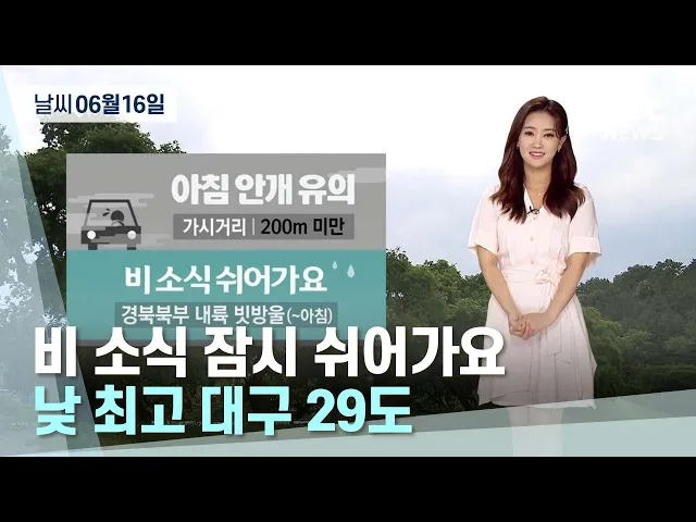 6월 16일 대구와 경북지역은 흐리다가 오후부터 맑겠습니다.아침 최저 기온은 대구와 포항 15.5도를 비롯해 구미 15.2, 안동 14.1도를 기록했습니다.경북 북부 내륙지역에는 아침까지 빗방울이 내리는 곳이 있겠습니다.낮 최고 기온은 대구 29도를 비롯해 24도에서 30도로 어제보다 높겠습니다.내일은 맑다가 오후부터 구름...
