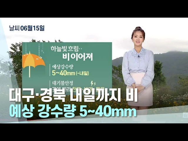 어제 하루 종일 하늘빛이 우중충하더니 새벽사이 비가 내렸습니다.현재 대구와 경북 대부분 지역에 내린 비는 내일(16일) 새벽까지 오는 곳이 많겠는데요. 내일(16일)까지 예상 강수량은 5~40mm로 비가 산발적으로 이어지겠습니다. 대기가 불안정한 가운데, 지역에 따라 강수 강도와 강수량의 차이가 크겠고요. 곳에 따라 ...