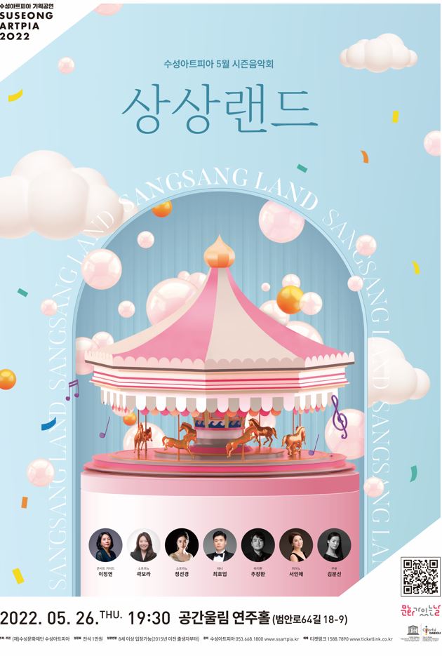 수성아트피아는 5월 시즌 음악회 ‘상상랜드’를 5월 26일 오후 7시 반 공감울림 연주홀에서 선보입니다.수성아트피아는 현재 리모델링을 하고 있어 수성구 내 민간 공연장인 '공간울림'을 활용해 이번 공연을 진행합니다.이번 공연은 소풍, 놀이동산, 자연과 동물, 슬픔과 희망, 가족과 안식처라는 테마로 구성해 온 가족이 ...