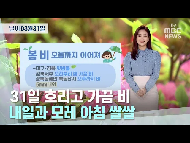 하루 사이 봄비를 머금고 꽃이 핀 곳이 많습니다.어제(3월 30일) 시작된 비는 오늘(3월 31일)까지 이어지겠는데요. 오늘(3월 31일) 대구와 경북 대부분 지역에는 산발적으로 빗방울만 떨어지겠고요. 경북서부내륙은 오늘(3월 31일) 오전부터 가끔 비가 내리다 밤에 대부분 그치겠습니다. 한편 경북동해안과 경북북동산지에...