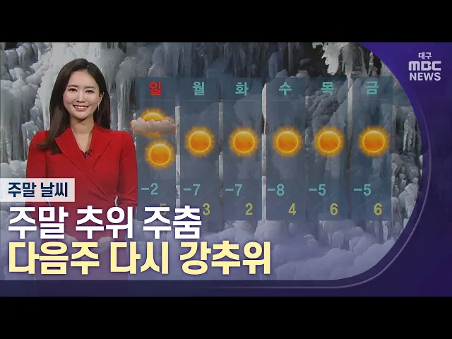 ◀앵커▶이번 주 우리 지역은 한파 특보부터 건조 특보, 거기다 강풍 특보까지 내려졌었는데요.건조한 날씨 속 칼바람까지 불며 겨울 강추위가 절정에 달했습니다.주말 동안은 잠시 추위가 쉬어가겠는데요.다음 주는 다시 기온이 뚝 떨어지겠습니다.자세한 날씨, 유하경 기상캐스터입니다.◀유하경 기상캐스터▶하얀 눈이 가득 ...