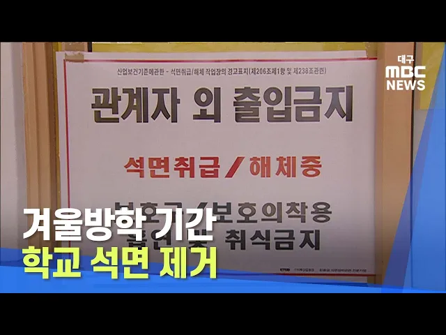대구시교육청은 대구시내 11개 초·중학교의 석면을 해체하고 제거합니다.대상은 남부교육지원청 관내 11개 초등학교와 중학교로 43억 원을 들여 이번 겨울방학 동안 석면 해체·제거 작업을 진행합니다.이번 작업이 완료되면 남부교육지원청 관내 학교 석면 제거율은 68%에 이르며 나머지 학교는 2025년까지 해체·제거작업을...