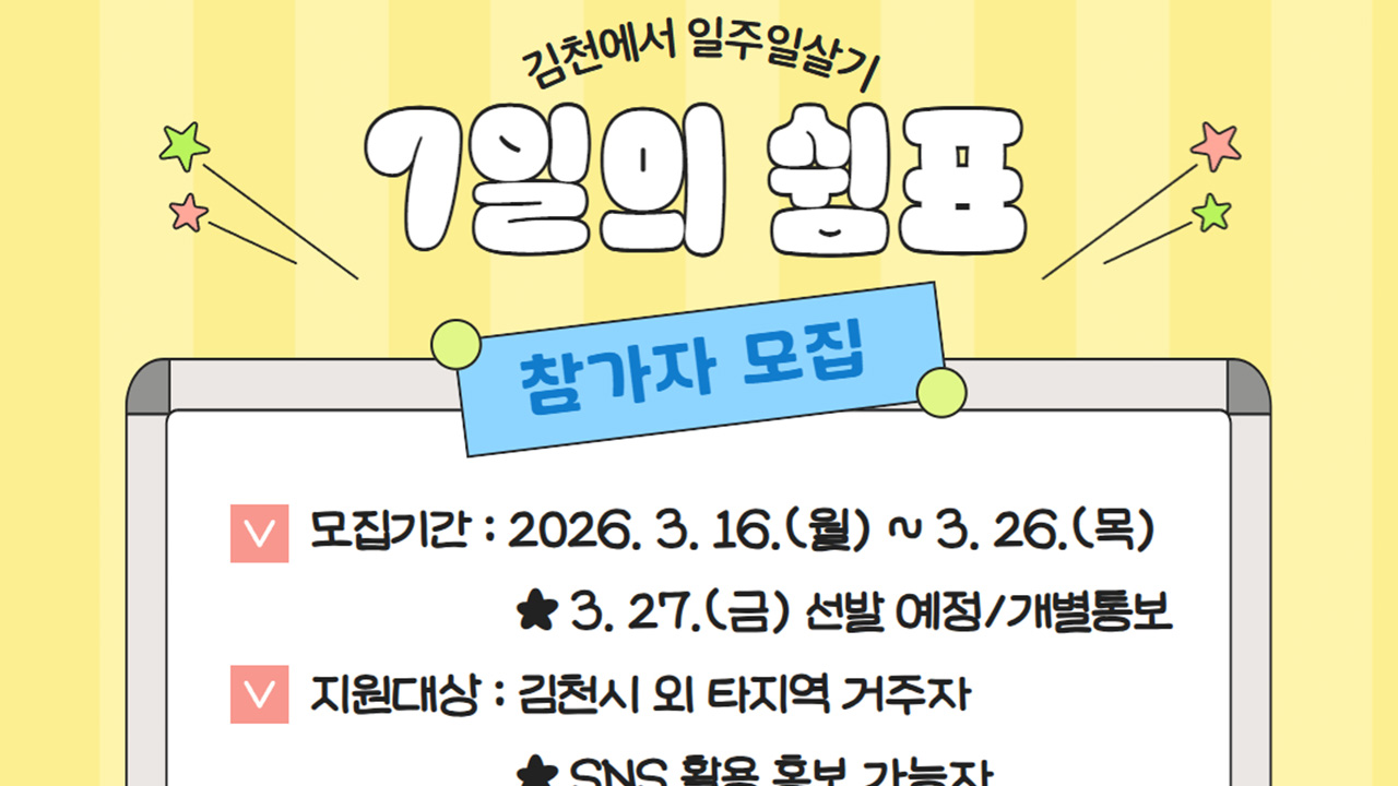 경북 김천시가 체류형 관광 프로그램 '7일의 쉼표 in 김천'을 운영하기로 하고 참가자를 모집합니다.'7일의 쉼표 in 김천' 참가자는 김천 지역 숙박업소에서 머무르면서 관광지를 방문하고 체험 활동한 뒤 여행 과정이나 관광 콘텐츠를 사회관계망 서비스를 통해 알리면 됩니다.김천시는 4월에는 4명이나 4팀(4명 이하)을 ...