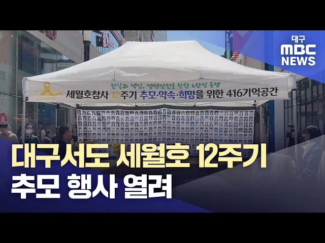 세월호 참사 12주기인 4월 16일 대구에서도 추모 행사가 열렸습니다.대구 동성로에 마련된 추모 기억공간을 찾은 시민들은 단원고 학생과 승객 등 희생자 304명의 넋을 기렸습니다.4월 25일, 대구 중구 경북대학교병원 대강당에서는 4·16합창단의 '별들의 노래 일지: 노란빛 순례-대구' 공연이 펼쳐집니다.4·16연대는 국민...
