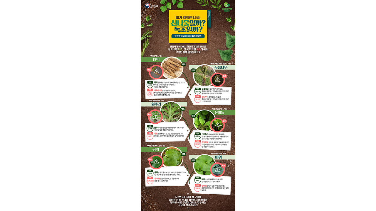 산나물과 비슷하게 생긴 독초를 채취해 섭취하는 일이 해마다 반복되자 관계 당국이 주의를 부탁했습니다.산림청과 식품의약품안전처는 최근 5년간 독초 섭취로 의심되는 신고는 94건으로, 미국자리공을 더덕으로, 붉나무를 두릅나무로, 독미나리를 미나리로, 여로를 원추리로 오인하는 경우가 많았다고 했습니다.특히, 전...
