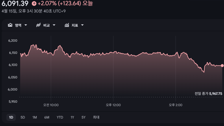 미국과 이란 간 추가 협상 가능성이 다시 커지며 코스피가 6천 선에서 마쳤습니다.4월 15일 지수는 6,141.60으로 출발해 오전 한때 6,183포인트까지 찍었지만, 장 후반 조금 밀리면서 전날보다 2.07% 오른 6,091.39로 거래를 끝냈습니다. 코스피가 6천 선을 넘겨 마감한 건 미국과 이란 간 전쟁이 일어나기 직전인 지난 2월...