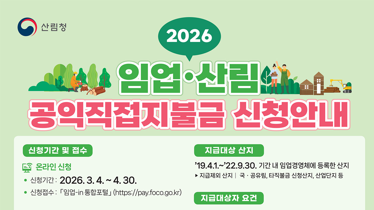 2026년 임업·산림 공익 직접지불금 신청·접수가 4월 30일에 마감됩니다.산림청에 따르면 임업 직불금 신청 대상은 2019년 4월 1일부터 2022년 9월 30일까지 임야 대상 농업 경영체(임업 경영체)에 등록된 산에서 실제로 임산물 생산업이나 육림업을 하는 임업인과 법인입니다.직불금 신청은 해당 산이 있는 읍면동 행정복지...