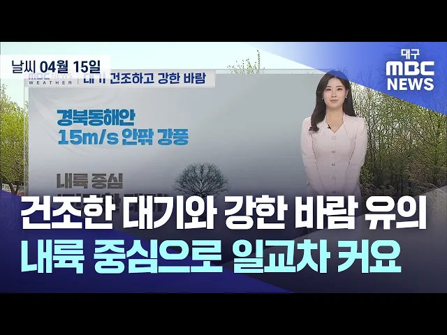 4월 14일 화요일은 대체로 흐린 가운데 대구와 경북 남부 지역에 밤까지 빗방울이 떨어지는 곳이 있겠습니다.낮 최고 기온은 대구 17.5도, 구미 21.5도, 영천 16.9도 등을 보였습니다.수요일은 대체로 흐리다가 오후부터 차차 맑아지겠습니다.아침까지 경북 남부 동해안에는 빗방울이 떨어지겠습니다.아침 최저 기온은 대구...