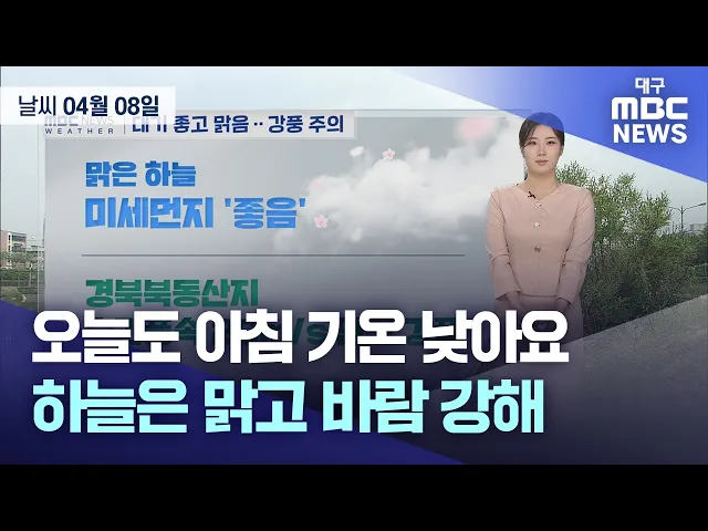4월 8일 수요일 대구와 경북 지역은 대체로 맑다가 밤부터 구름 많아지겠습니다.아침 최저 기온은 대구 2.1도 등 영하 4도에서 영상 6도의 분포로 전날보다 1~2도가량 낮았습니다.낮 최고 기온은 대구 18도 등 14도에서 19도로 예보됐습니다.목요일 오전부터 금요일 낮까지 30에서 80밀리미터의 비가 내리겠습니다.대구기상...