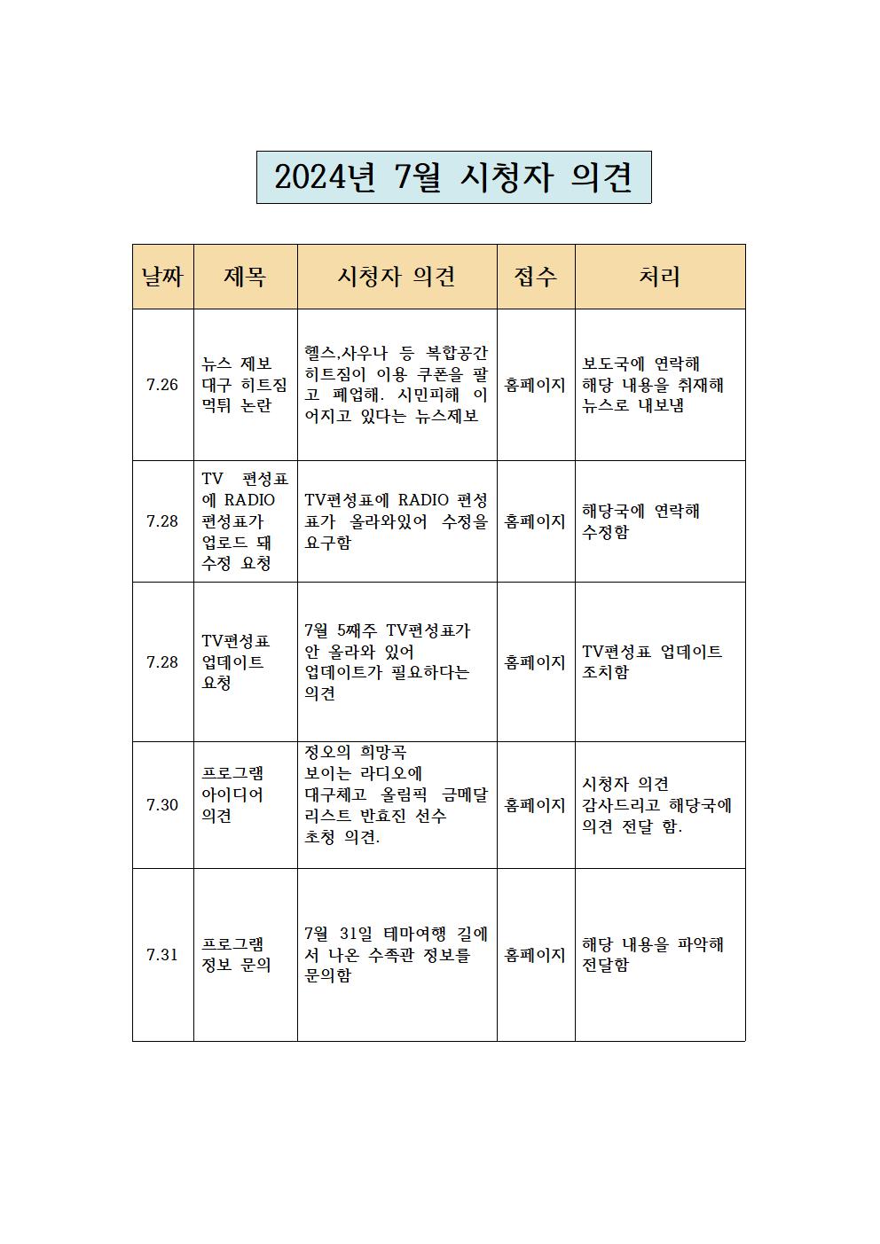 2024년 7월 시청자 의견 접수 및 처리 현황