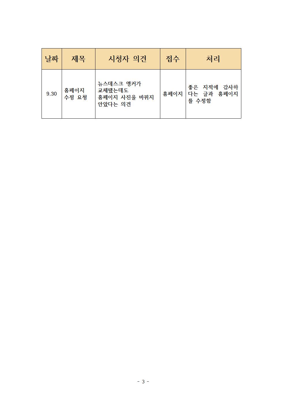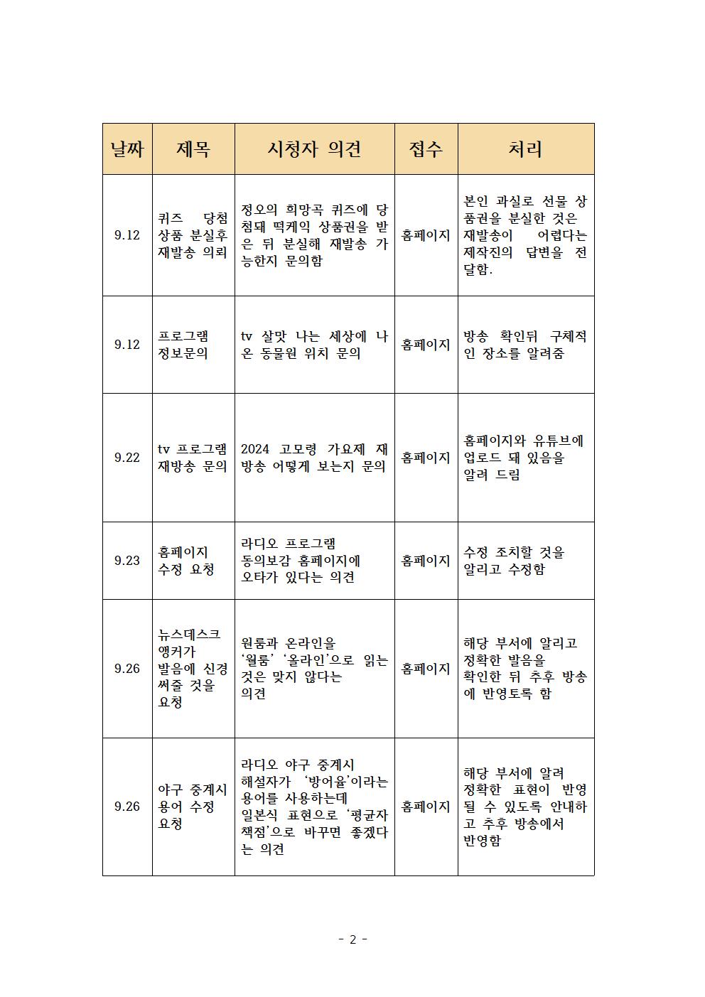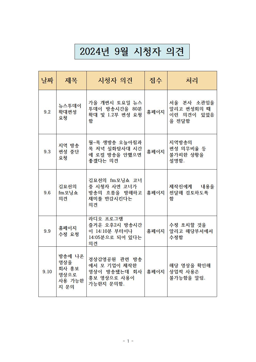 2024년 9월 시청자 의견 접수 및 처리 현황
