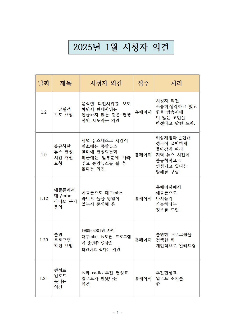 2025년 1월 시청자 의견 접수 및 처리 현황